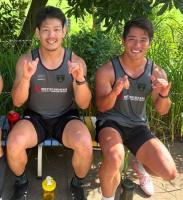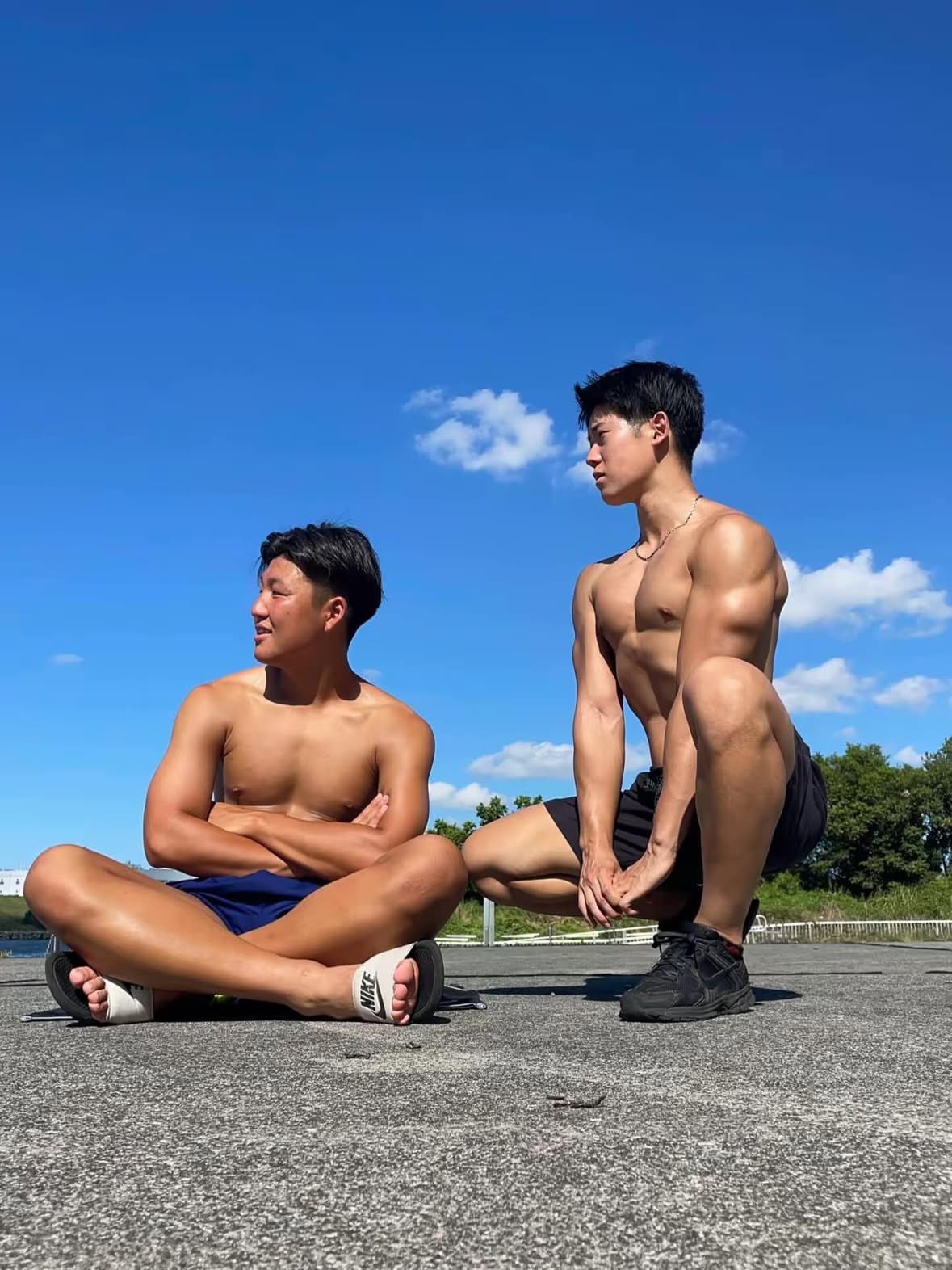 ガタイいいねぇ、と褒められ「そんなことないッスよ」と言いつつも腕を自慢げに触る。