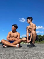 スタッフ青年と懇談中、ガタイを褒められ腕を捲る青年。