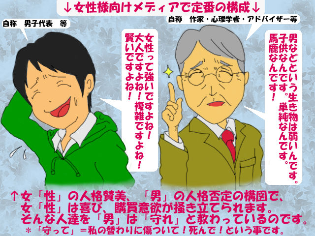 同感。男は馬鹿でとかサイテーだとかなんか男というものを勝手に語ってて腹立つ。